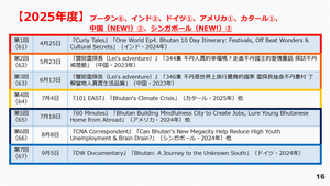 The first Bhutan Seminar of the 2025 academic year took place online on Friday, 25 April. The first session (the 61st overall) explored the latest trends in Bhutanese travel and cultural experiences as depicted in Indian YouTube videos. After watching the videos, commentator Lecturer Hirayama gave a brief talk on changes to the travel system and the number of foreign visitors before and after the pandemic, as well as the appeal of Bhutan as a travel destination from an Indian perspective. Information sharing then continued in the form of answering questions from participants.