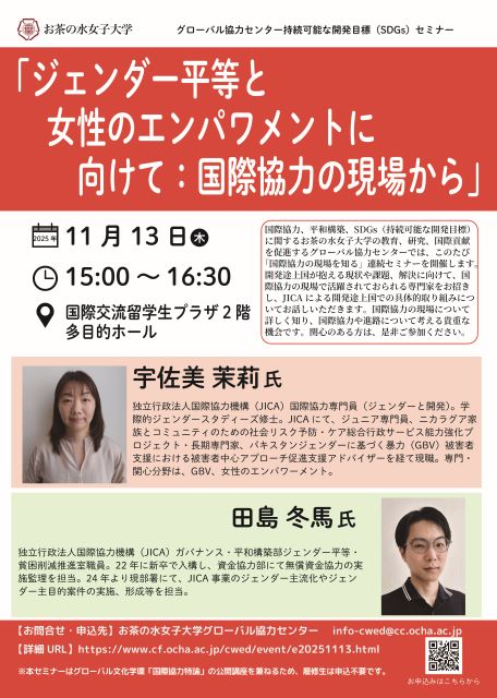 国際協力、平和構築、SDGs(持続可能な開発目標)に関するお茶の水女子大学の教育、研究、国際貢献を促進するグローバル協力センターでは、このたび「国際協力の現場を知る」連続セミナーを開催します。開発途上国が抱える現状や課題、解決に向けて、国際協力の現場で活躍されておられる専門家をお招きし、独立行政法人国際協力機構(JICA)による開発途上国での具体的取り組みについてお話しいただきます。第2回目となる今回は、ジェンダーをテーマに宇佐美茉莉氏と田島冬馬氏にお話しいただきます。国際協力の現場について詳しく知り、国際協力や進路について考える貴重な機会です。 関心のある方は是非ご参加ください。