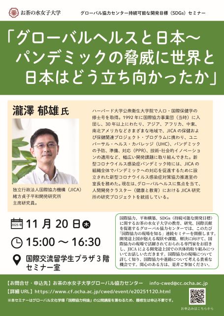 国際協力、平和構築、SDGs(持続可能な開発目標)に関するお茶の水女子大学の教育、研究、国際貢献を促進するグローバル協力センターでは、このたび「国際協力の現場を知る」連続セミナーを開催します。開発途上国が抱える現状や課題、解決に向けて、国際協力の現場で活躍されておられる専門家をお招きし、独立行政法人国際協力機構(JICA)による開発途上国での具体的取り組みについてお話しいただきます。第3回目となる今回は、保健をテーマに瀧澤郁雄氏にお話しいただきます。国際協力の現場について詳しく知り、国際協力や進路について考える貴重な機会です。 関心のある方は是非ご参加ください。
