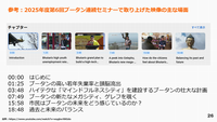 2025年12月19日(金曜日)にオンラインにて、2025年度第12回ブータン連続セミナーが開催されました。第12回(通算72回目)となる今回は首相のインタビューを取り上げました。参加者からは、国王主導で進められている「ゲレフ・マインドフルネス・シティ」(Gelephu Mindfulness City: GMC)特区構想の現状やブータンの雇用対策、農業自給率等関する質問・コメントが寄せられました。