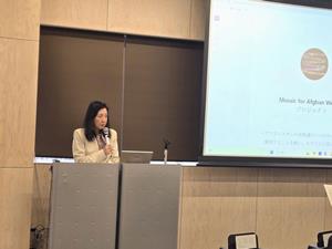 続いて本学基幹研究院自然科学系の森義仁教授から、アフガニスタン支援を立ち上げた当時の思い出や、受け入れた学生たちの変化、日本での生活や文化に溶け込んでいく様子が、多くの写真とともに紹介されました。特に、学生たちが次第に自由に人生を楽しんでいく様子がとても印象的でした。最後に、アフガニスタンの言葉で「困ったときはお互い様」を意味する文章が紹介され、人を思いやることの大切さを改めて認識する機会となりました。