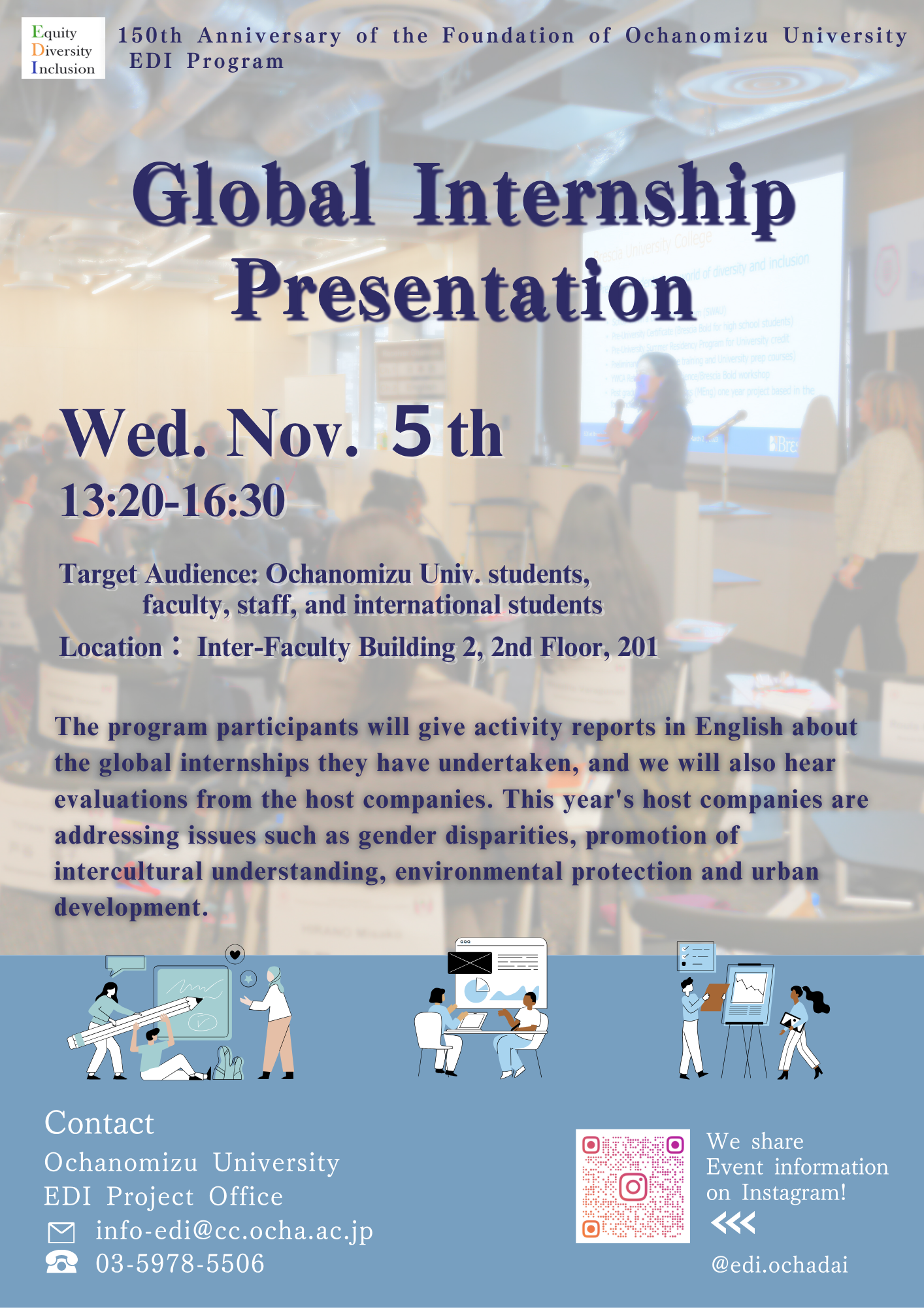 EDI Program will hold the Global Internship Presentation on Wednesday, November 5th, 2025, from 13:20 to16:30 at Ochanomizu University, Hisao & Hiroko TAKI PLAZA 2nd Floor, Multipurpose Room.