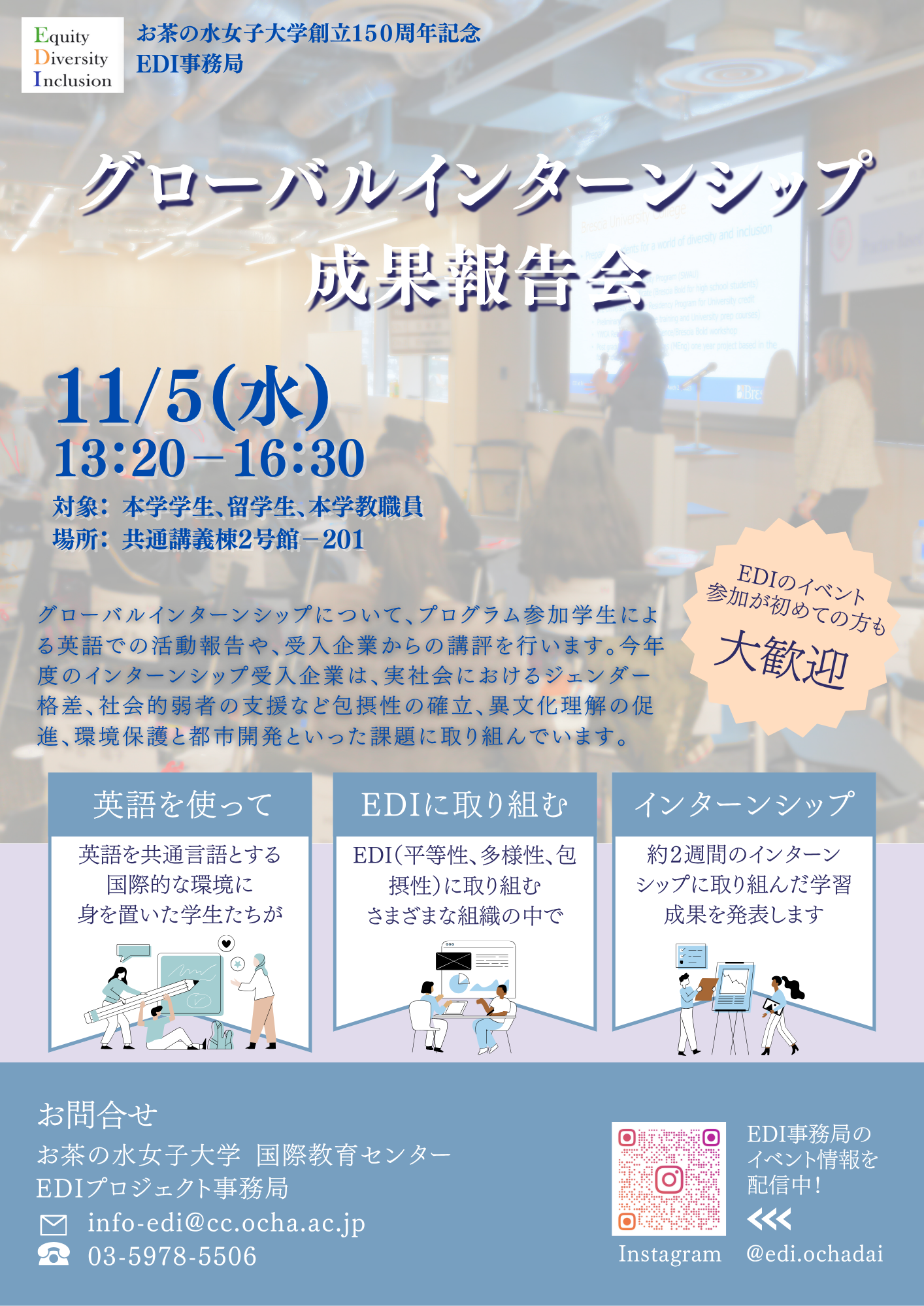 2025年11月5日(水)に、EDIプログラム参加学生による「グローバルインターンシップ成果報告会」を実施します。本成果報告会では、インターンシップでの活動内容を英語で紹介し、受入企業からの講評を行います。今年度の受入企業は、実社会におけるジェンダー格差、社会的弱者の支援など包摂性の確立、異文化理解の促進、環境保護と都市開発といった課題に取り組んでいます。皆様のご参加をお待ちしております。