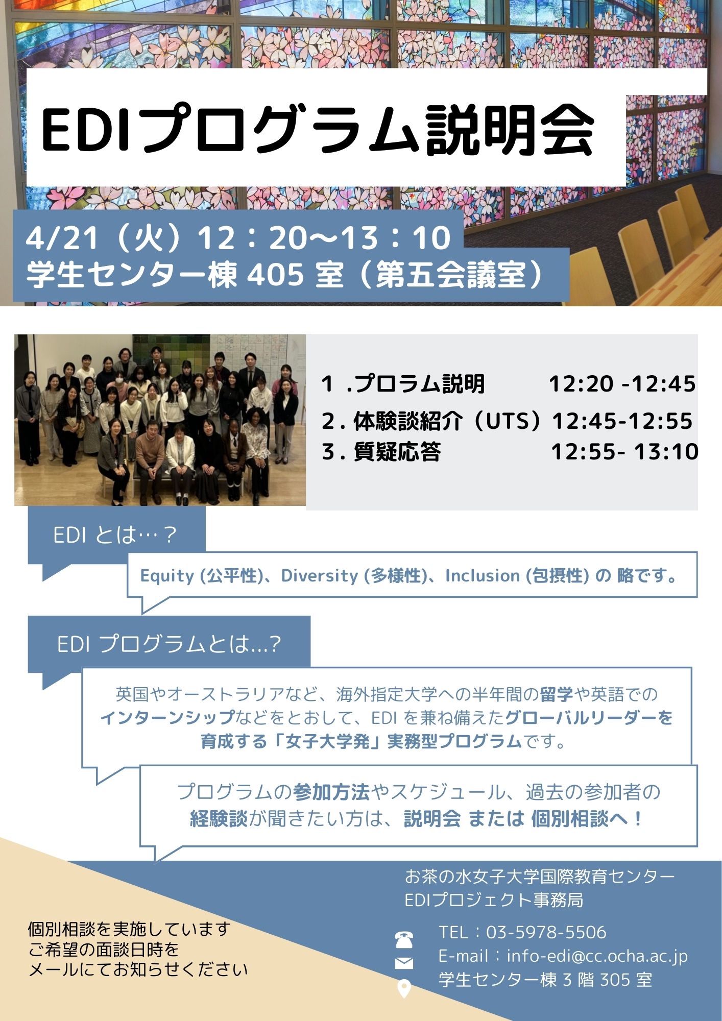 EDIプログラムは、英国、オーストラリア、米国、カナダ、インドの指定する協定校への半年間の留学、英語によるインターンシップを含むプログラムに参加することで、EDI(公平性(Equity)、多様性(Diversity)、包摂性(Inclusion))を兼ね備えたグローバルリーダーを育成するプログラムです。 現在、第5期派遣学生を募集中です。説明会では、EDIプログラムの紹介及び、体験談紹介(UTS)を行います。 留学に興味ある方はぜひご参加ください。