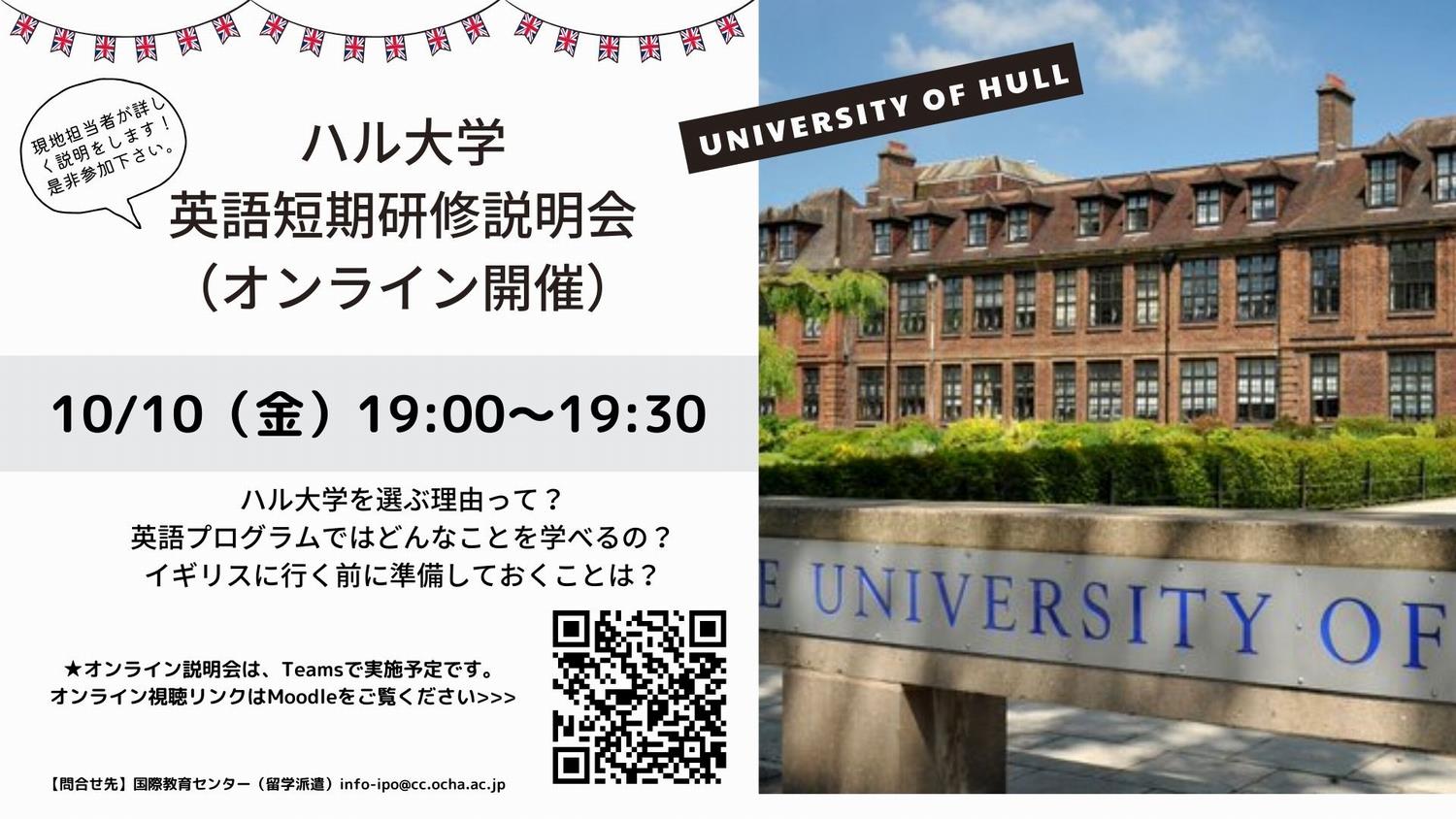 本学の海外協定校である 「 ハル大学英語短期研修オンライン説明会 」を開催します。 ハル大学を選ぶ理由って?英語プログラムではどんなことを学べるの?イギリスに行く前に準備しておくことは?など、現地担当者が詳しく説明をします!是非参加下さい。