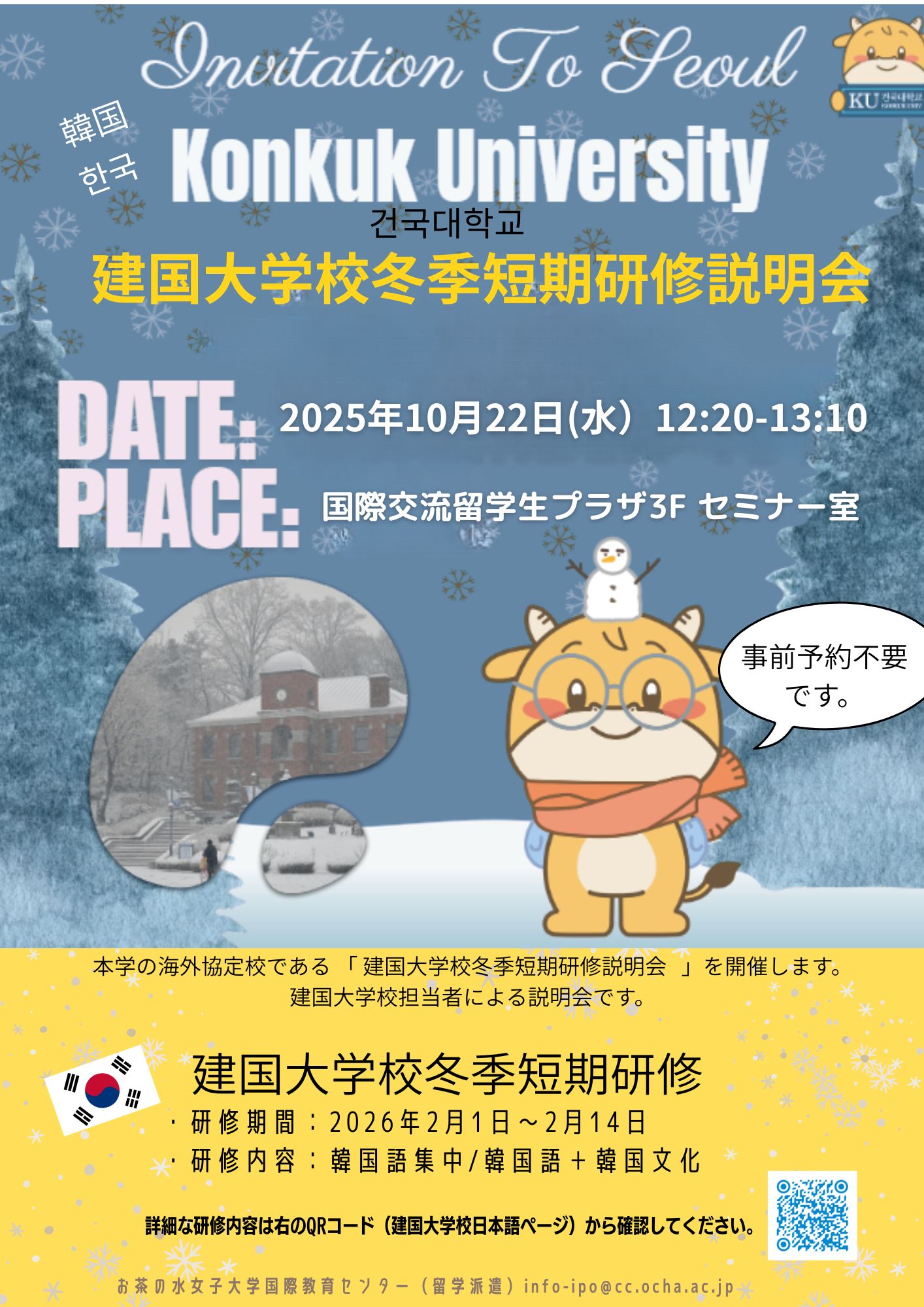 本学の海外協定校である 「 建国大学校冬季短期研修説明会 」を開催します。建国大学校担当者による説明会です。 積極的にご参加ください。