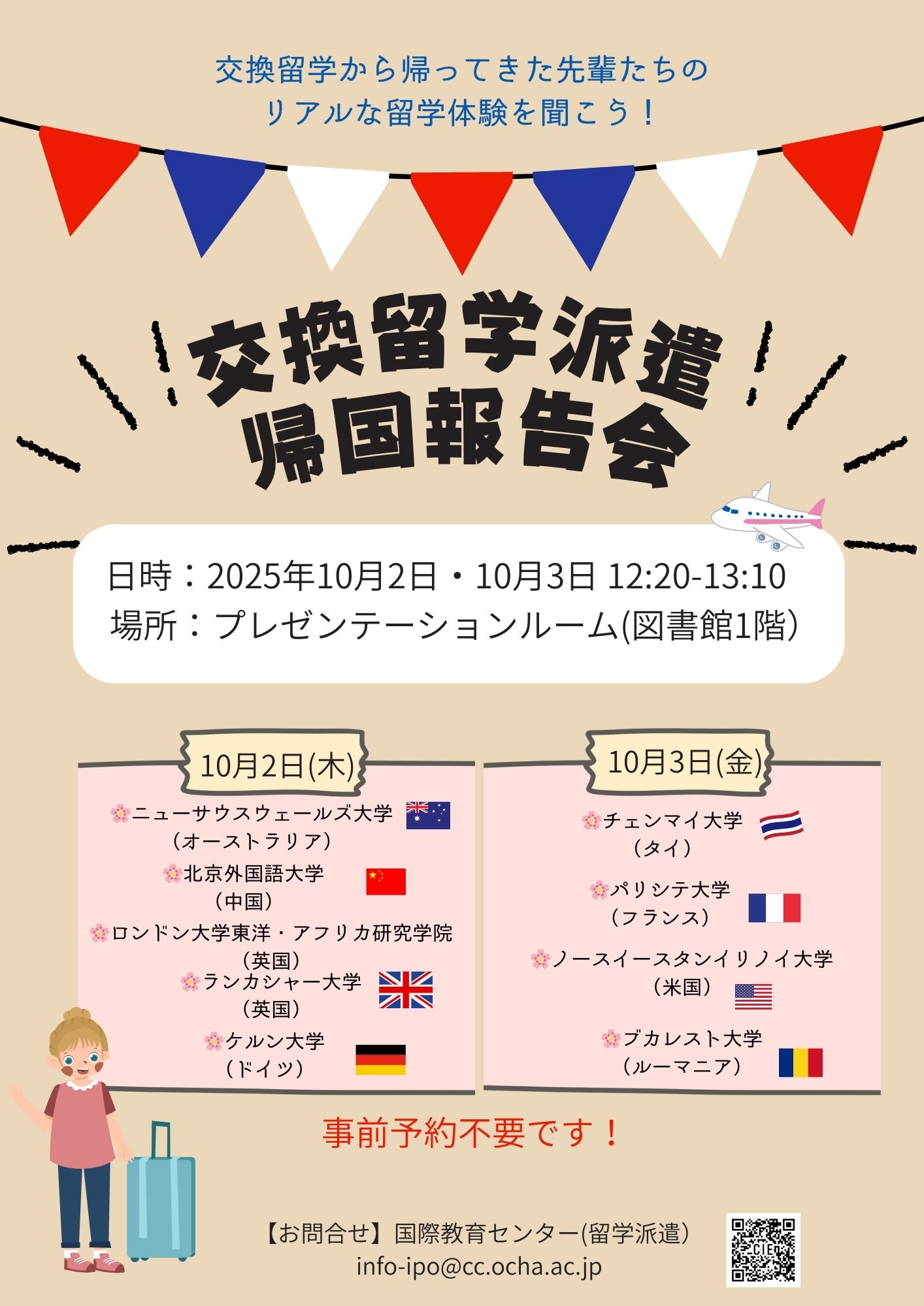 「交換留学派遣者帰国報告会」 を実施します。留学中の生活、実現したかった事、留学での経験を今後どのように活かしていきたいかなどの話が聞けます! 先輩たちの留学経験から学べるチャンスです。留学に興味がある方はぜひ参加してください!