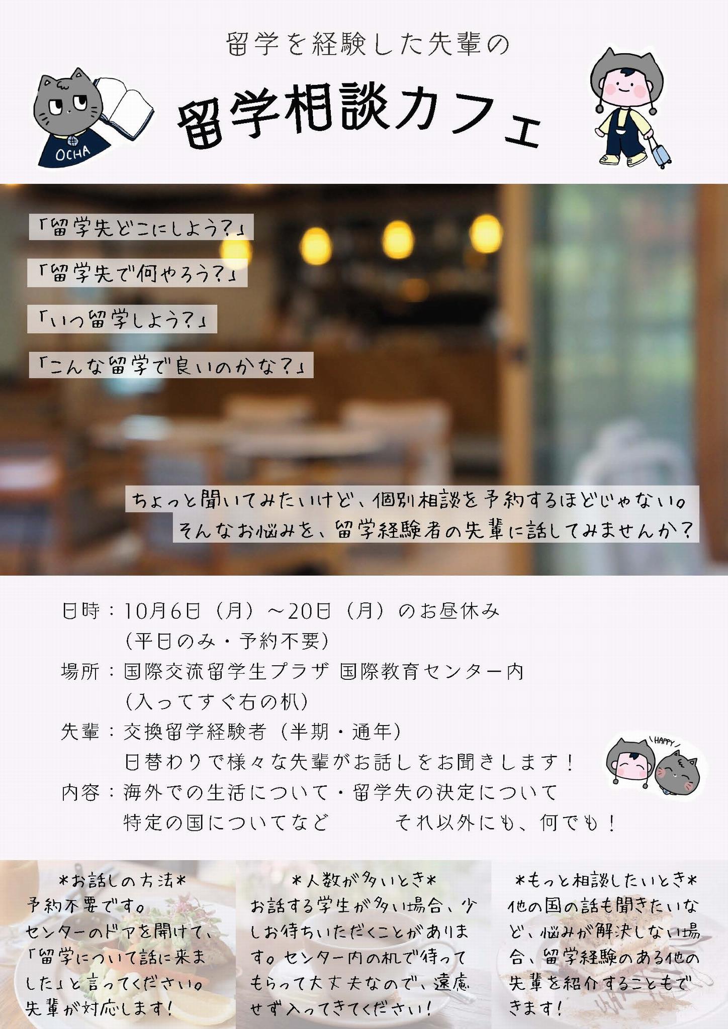 ちょっと聞いてみたいけど、個別相談を予約するほどじゃない。そんなお悩みを、留学経験者の先輩に話してみませんか?海外での生活、留学先の決定、なんでも相談してみましょう!留学経験者の先輩に気軽に相談できます。 積極的にご参加ください。