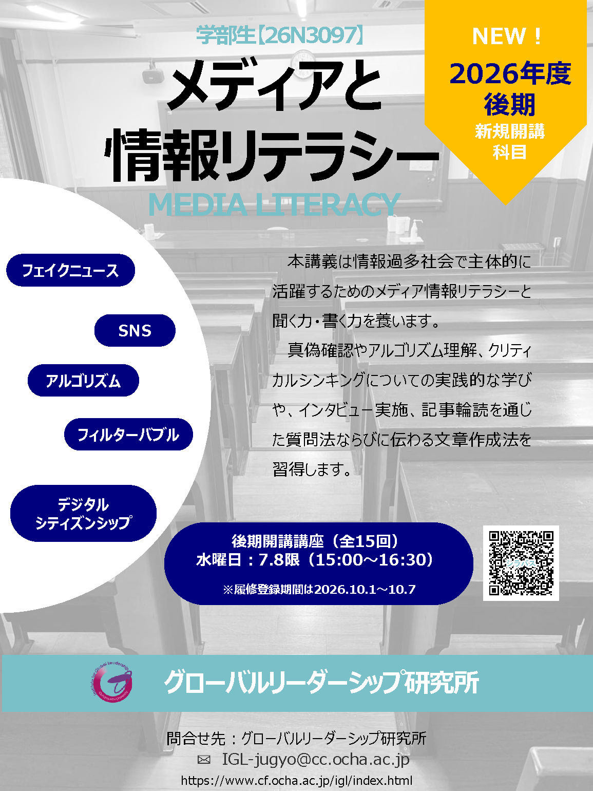本講義は情報過多社会で主体的に活躍するためのメディア情報リテラシーと聞く力・書く力を養います。真偽確認やアルゴリズム理解、クリティカルシンキングについての実践的な学びや、インタビュー実施、記事輪読を通じた質問法と伝わる文章作成法を習得します。