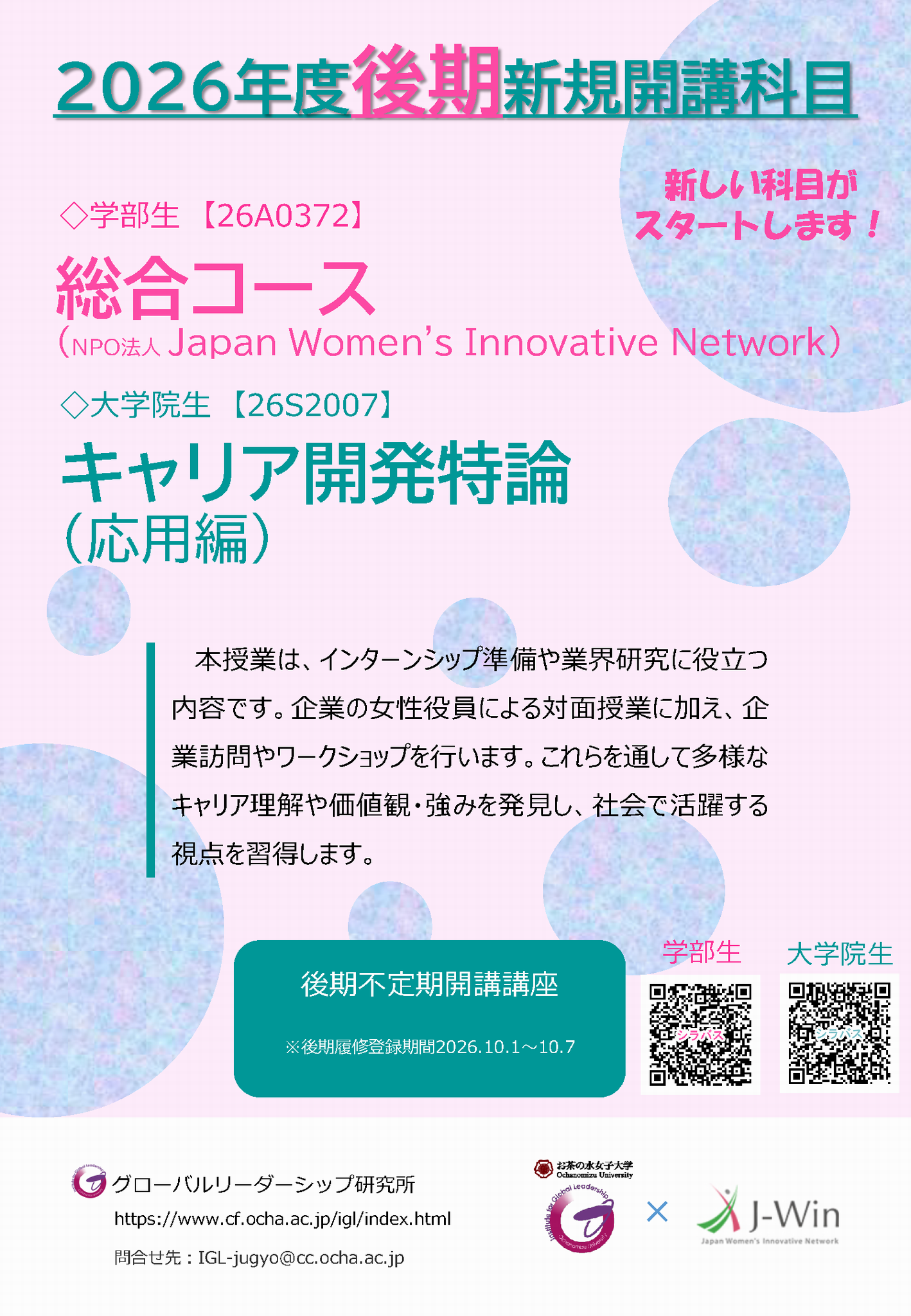アクセンチュア株式会社協力のもと、本学卒業生を含む同社社員による講義や、社員と学生とのグループワークを通して、仕事、キャリア、グローバル人材とは何かについて学び考え、自らのキャリアプランを考えることを目的としています。