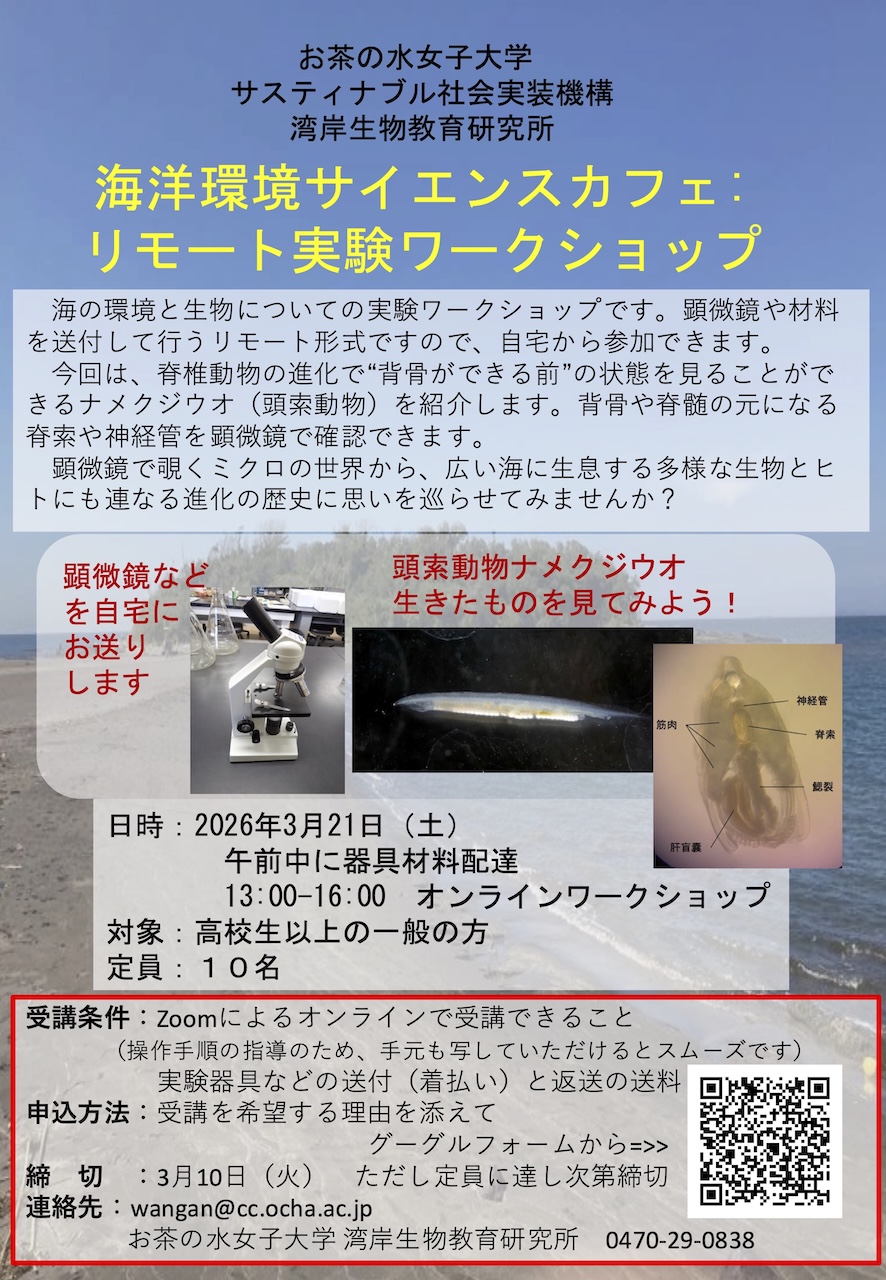 海の環境と生物についての実験ワークショップです。顕微鏡や材料を送付して行うリモート形式ですので、自宅から参加できます。