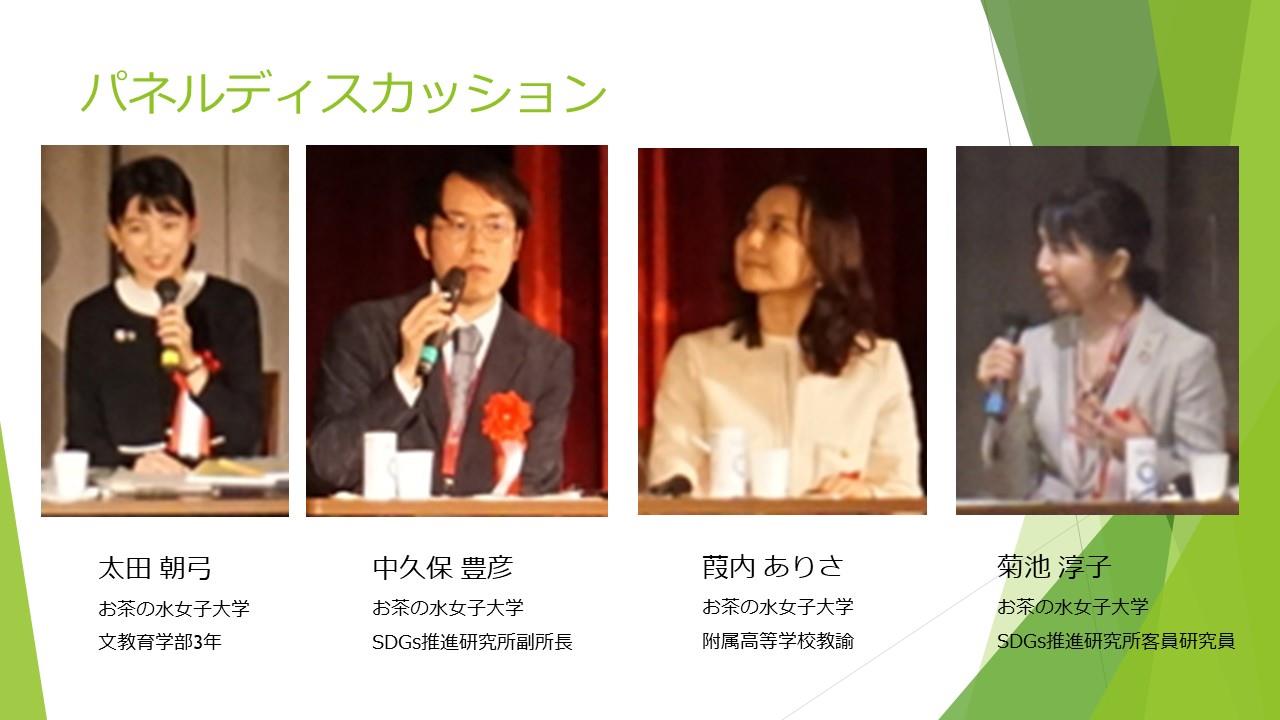 続いて、「OCHA-SDGsに期待すること」と題したパネルディスカッションが行われた。パネリストは味の素株式会社執行役サステナビリティ・コミュニケーション担当の森島千佳氏、大日本印刷株式会社サステナビリティ推進部部長の鈴木由香氏、株式会社セブン&アイ・ホールディングス執行役員の釣流まゆみ氏、本学文教育学部3年の太田朝弓さん、本学SDGs推進研究所副所長の中久保豊彦准教授、本学附属高等学校教諭の葭内ありさ先生の6名である。パネリストの方々にこれまで行ってきたSDGs研究の内容や、OCHA-SDGsに期待することについてお話いただいた。