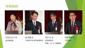 *シンポジウム会場では、文中で紹介した基調講演者、パネリストのほかにも、産官学の各界からのご来賓からご挨拶や応援メッセージをいただきました。下の一覧(ご登壇順)と掲載の写真でご紹介させていただきます。