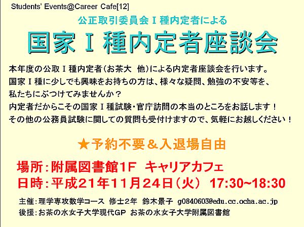 Students' Events@Career Cafe [13] 公取業務説明会・国家I種内定者座談会のお知らせ