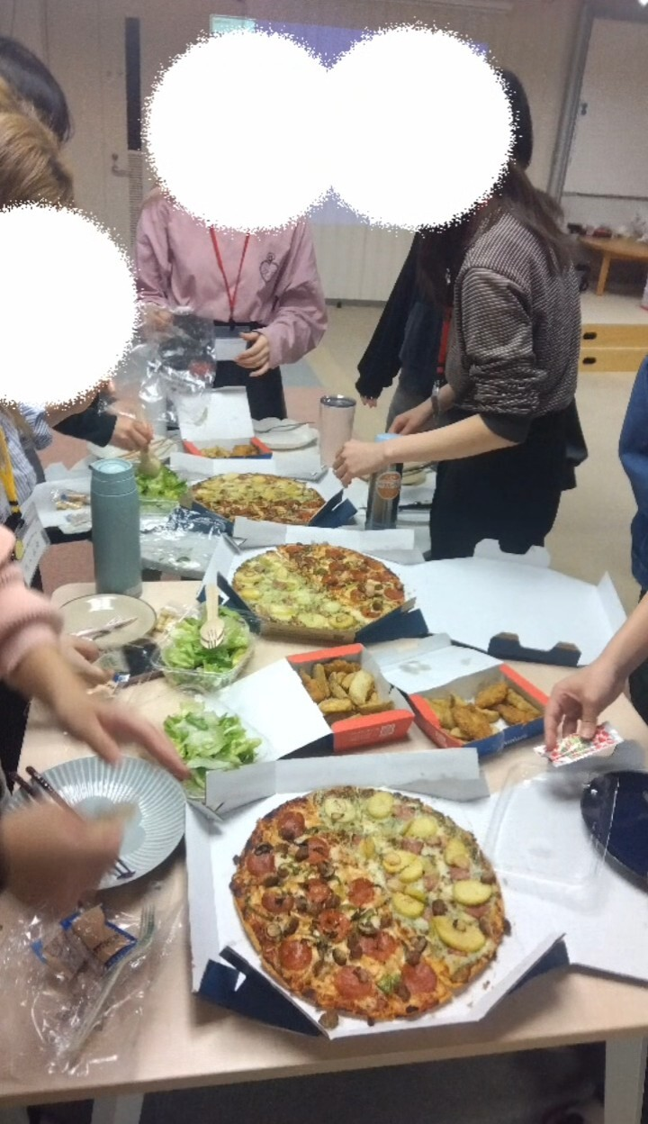お昼ご飯では、ピザやチキン、フライドポテトやサラダを立食形式で戴きました。去年はハウスごとに別々で食べたのですが、今年はハウス入り乱れてざっくばらんに昼食をとったので、普段あまり話す機会のないほかのハウスの人とも、ご飯を食べながら楽しくおしゃべりできました。