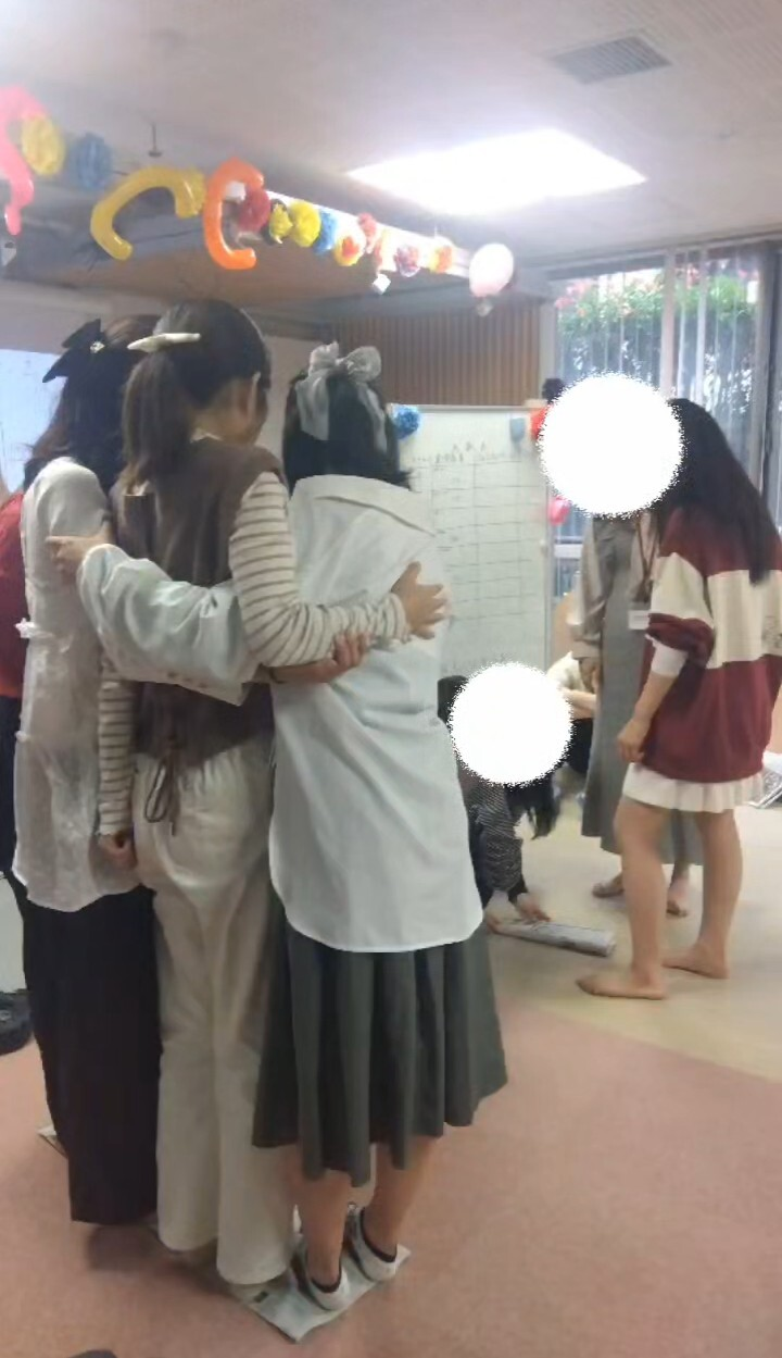 ミニ運動会では、ランダムに選ばれたメンバーでチームを組んで、新聞紙島とジェスチャーゲームを行いました。新聞紙島とは、一枚の新聞紙の上にチーム全員で乗り、じゃんけんで負けたチームは新聞紙を半分に折っていき、最後までメンバーが乗っていたほうのチームが勝ちというものです。新聞の折り方を工夫したり、じゃんけんに強い人を探したりと、各チームいろいろな工夫が見て取れました。ジェスチャーゲームでは、各チームで一人ずつお題に合わせたジェスチャーを行い、ほかのメンバーの正解数を競います。お題の中には「お茶大」や「みゃくみゃく」など、ジェスチャーでは表現しにくいものもあったので、正解にたどり着くにはハードルが高かったです。